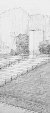 Blue Sky’s design was unusual for monuments at the time, with low-set stone work instead of a tall obelisk. The granite memorial overlooks a pond and contains 24 crypts laid out like steps descending to the water’s edge. An inverted mausoleum, the structure has no ceiling or walls. As Wright once described, “If monuments must be, why not now extend the monument horizontally, keeping it broad and low instead of pushing it upward to make the usual inane forest of stone posts?”
